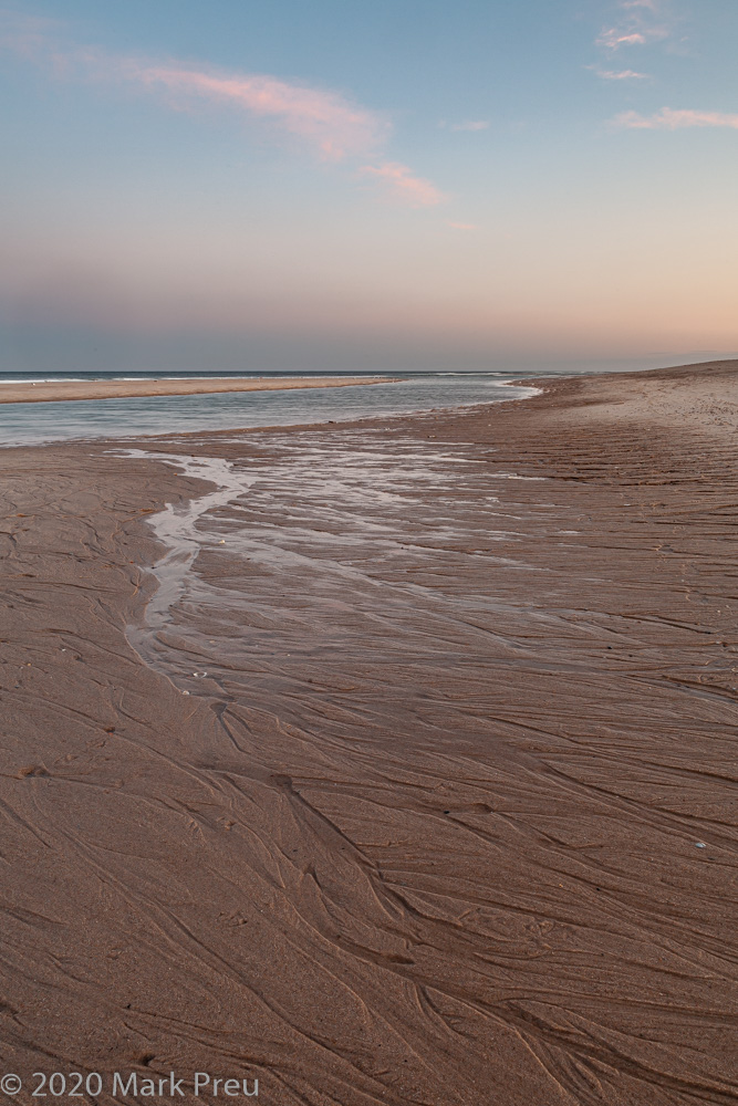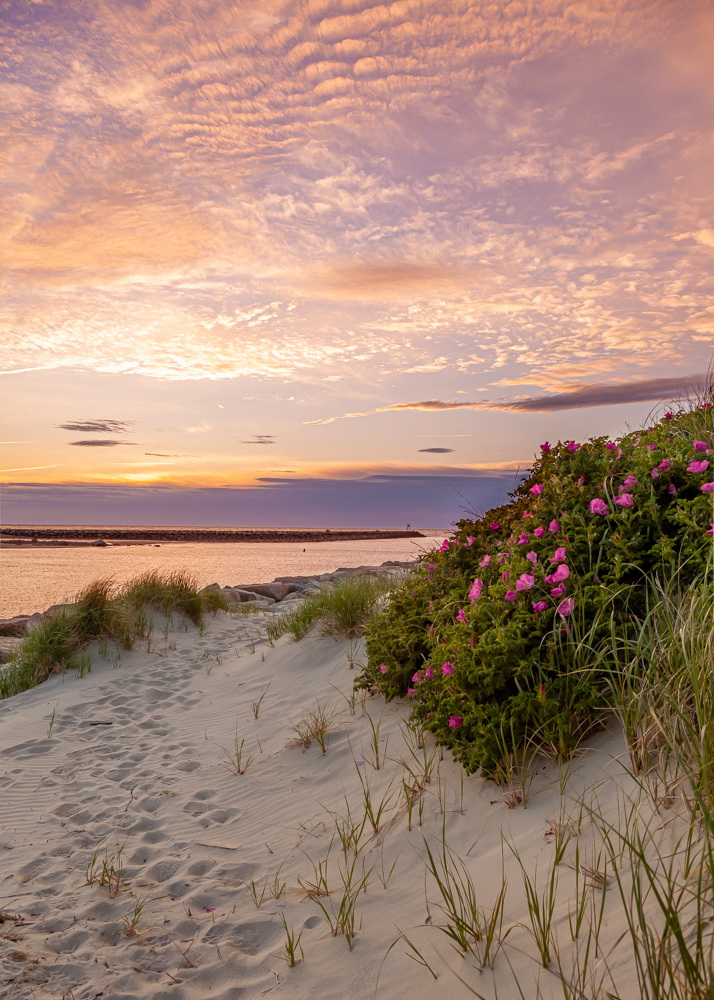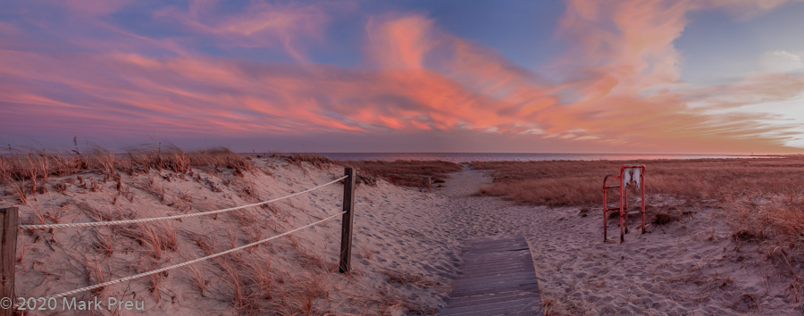 The beach itself, along that part of Nantucket Sound, is a straight band of sand, not offering much of visual interest, and the small waves broke up what on a still evening would have been great reflections. I drove the mile length of the parking area, seeing how the sky and foreground related to each other. The color started to come up as the sun disappeared. I turned around and decided the best foreground was a section of dune and pathway. And then this was my reward-